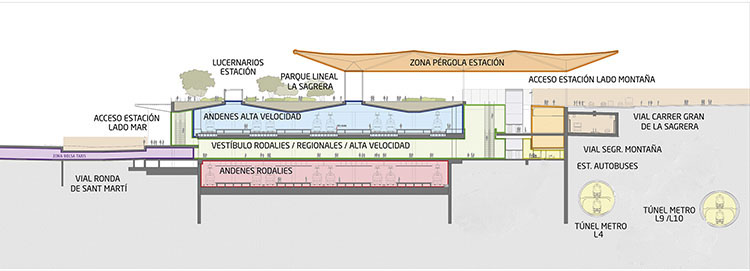 CROSS SECTION OF THE STATION. The design of La Sagrera intermodal station facilitates transfers between different modes of transport. / IMAGE_ADIF ALTA VELOCIDAD AND BSAV